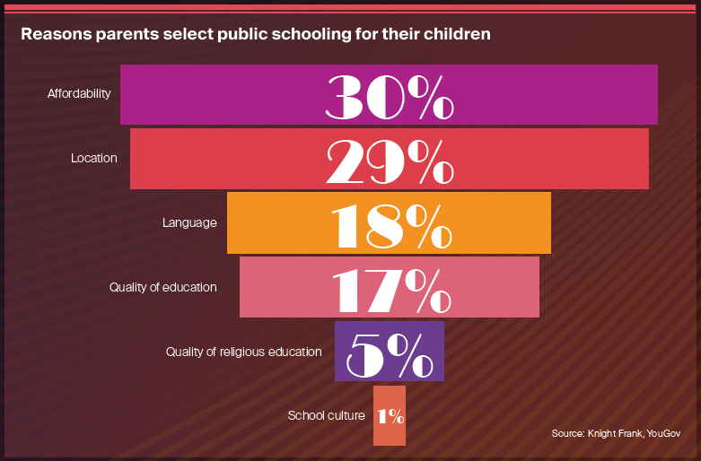 Location (29%) closely follows as a reason for selecting a public school. In our 2022 Saudi Report, having easy access to amenities, i.e., within walking distance or a short drive away, was a common thread that linked all respondents. As Saudi cities continue to evolve and grow, commuting is becoming a greater consideration for home buyers and tenants, as well as parents.