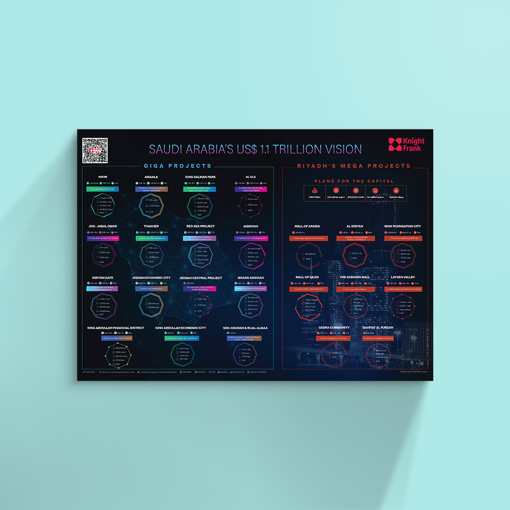 يسلّط الإنفوجرافيك البحثي الضوء على أن مشاريع العقارات والبنية التحتية ضمن رؤية المملكة العربية السعودية 2030 تتجاوز قيمتها 1.1 تريليون دولار أمريكي.